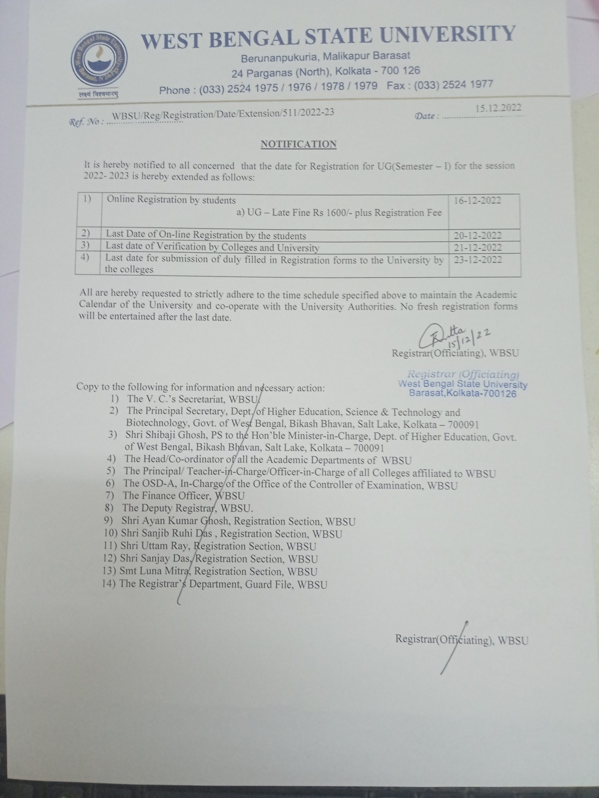 Notification for Registration for UG (SEM 1)